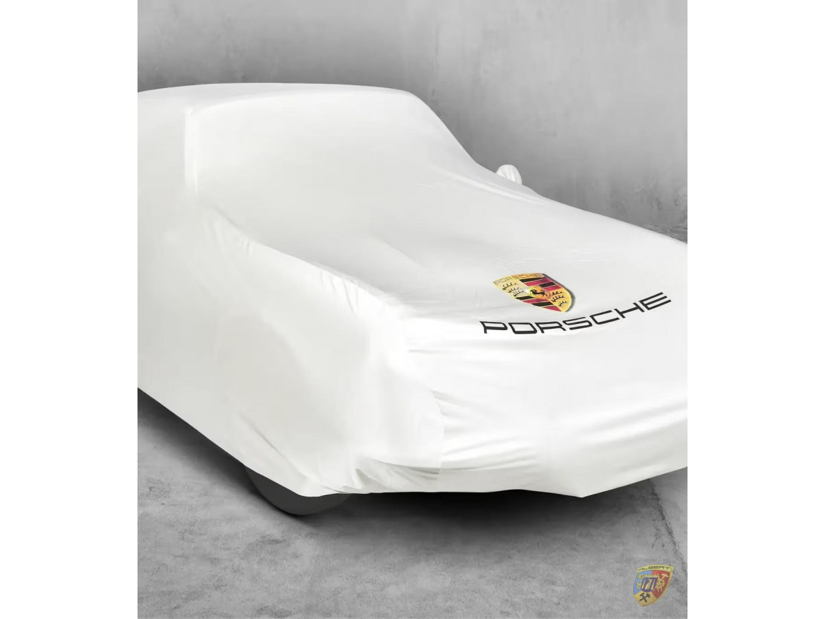 Indoor-Abdeckhülle in weiß mit Porsche Wappen und Schriftzug. Bestehend aus 100 Prozent Polyester.