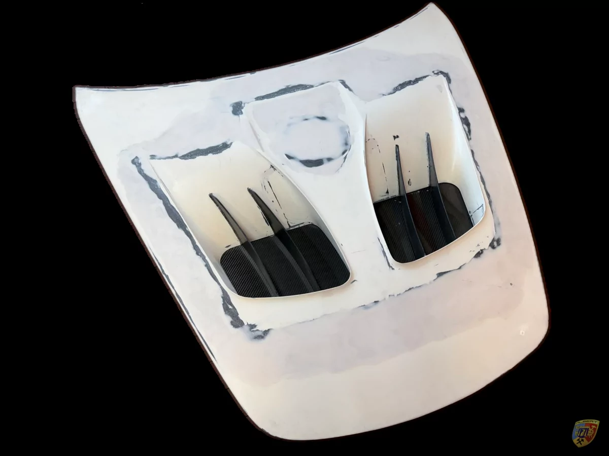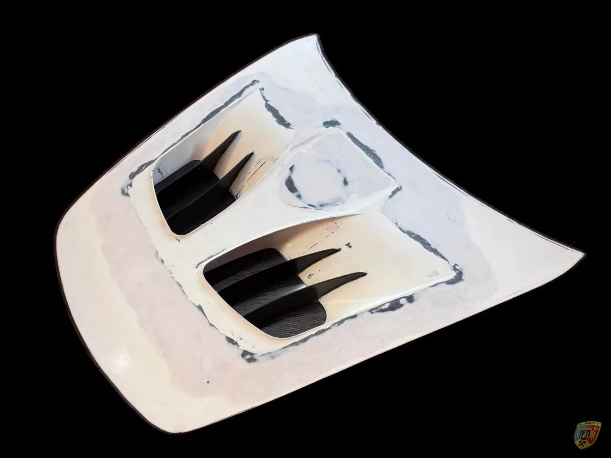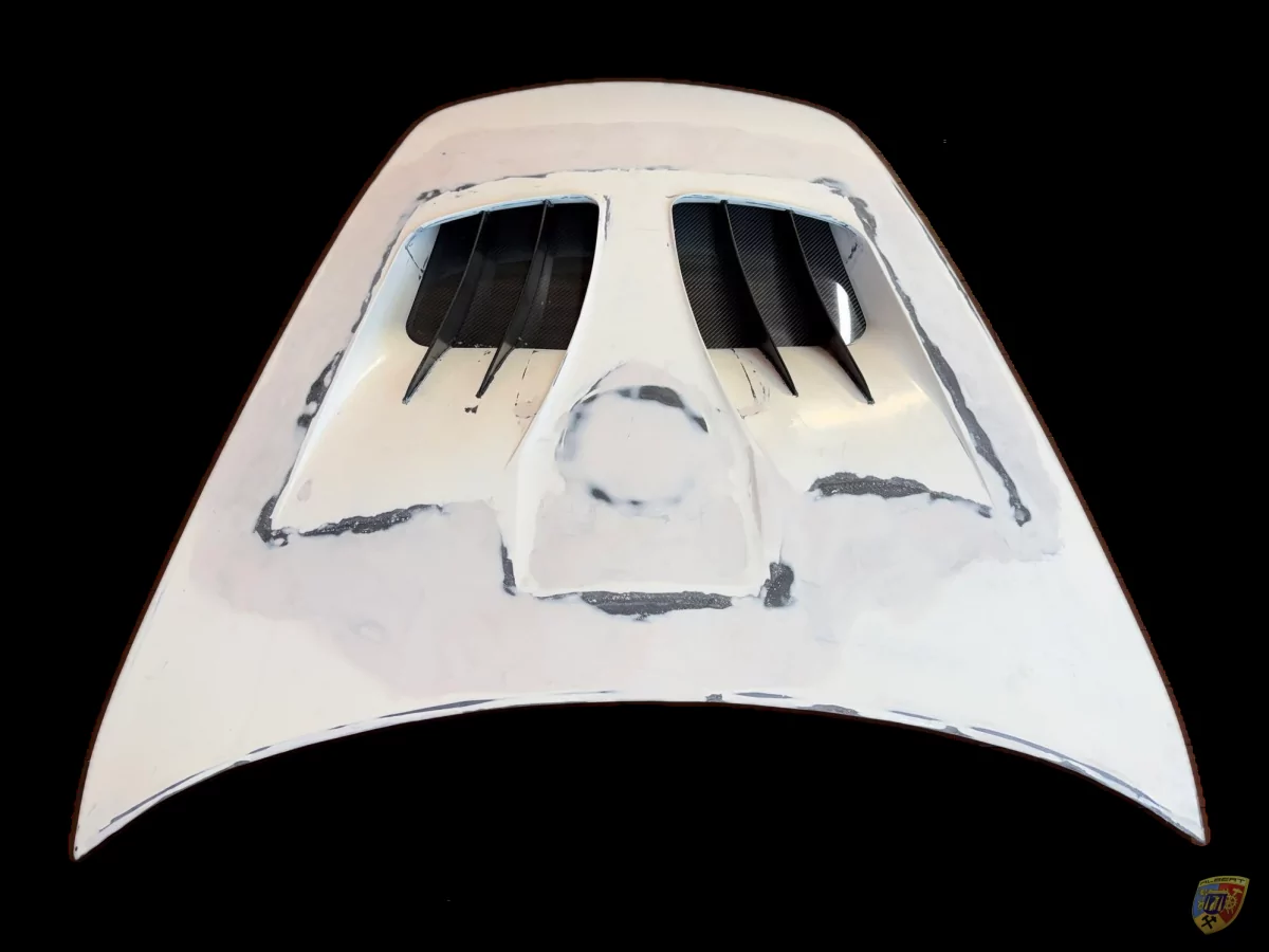 Die Bauteile werden dann auf Maß geschnitten und in der Form der 997 Fronthaube zusammen laminiert.