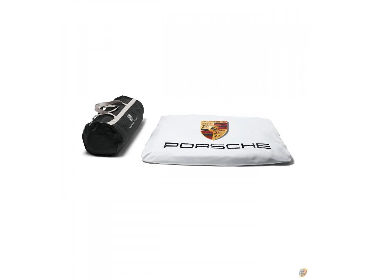 Housse de voiture intérieure blanche ornée du logo et de l'inscription Porsche. 100 % polyester.